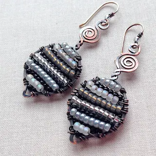 A little bit of sparkle, a little bit grunge, a little bit boho - and it's a new style for me. They are well made, I learned some new techniques and will be listed in my Etsy shop shortly. All good stuff. I added sterling silver ear wires with a matching bead and small copper coil to tie it all together. Everything is oxidized with liver of sulfur